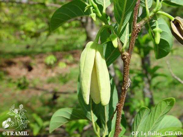 Tree of up to 10 metres. Elliptic-lanceolate to oblong leaves of 6-12 cm, acute to short-acuminate, dotted. Flowers in small or solitary clusters, pale yellow, outer petals linear-oblong up to 2.5 cm, pubescent on the outside, the inner petals small ovate or obovate. Subglobose or ovoid fruit of 5-9 cm, prominent carpels, rounded on the back, white-yellowish, sweet flesh. Seeds 1-1.5 cm oblong, black.
