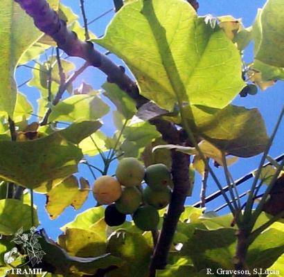 Arbuste ou petit arbre pouvant atteindre 5 m, avec un latex jaune laiteux ou rougeâtre. Feuilles arrondies-ovées, à 3-5 lobes, cordées à la base, à l’extrémité aiguë ou acuminée. Cymes petites, denses, à longs pédoncules; pétales blanchâtres oblong-ovés, à pilosité dense. Capsule ellipsoïdale, de 2,5 à 4 cm. Graines de 2 cm, noirâtres.